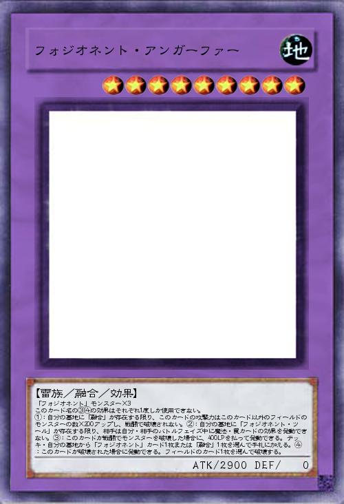 | 「フォジオネント」モンスター×3 このカード名の③④の効果はそれぞれ1度しか使用できない。 ①:自分の墓地に「融合」が存在する限り、このカードの攻撃力はこのカード以外のフィールドのモンスターの数×200アップし、戦闘で破壊されない。②:自分の墓地に「フォジオネント・ツール」が存在する限り、相手は自分・相手のバトルフェイズ中に魔法・罠カードの効果を発動できない。③:このカードが戦闘でモンスターを破壊した場合に、400LPを払って発動できる。デッキ・自分の墓地から「フォジオネント」カード1枚または「融合」1枚を選んで手札に加える。④:このカードが破壊された場合に発動できる。フィールドのカード1枚を選んで破壊する。 | |||