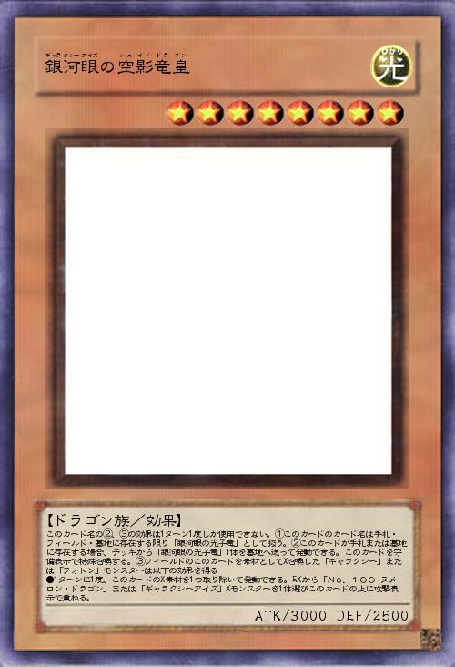 | このカード名の②、③の効果は1ターン1度しか使用できない。①このカードのカード名は手札・フィールド・墓地に存在する限り「銀河眼の光子竜」として扱う。②このカードが手札または墓地に存在する場合、デッキから「銀河眼の光子竜」1体を墓地へ送って発動できる。このカードを守備表示で特殊召喚する。③フィールドのこのカードを素材としてX召喚した「ギャラクシー」または「フォトン」モンスターは以下の効果を得る ●1ターンに1度、このカードのX素材を1つ取り除いて発動できる。EXから「No.100 ヌメロン・ドラゴン」または「ギャラクシーアイズ」Xモンスターを1体選びこのカードの上に攻撃表示で重ねる。 | |||