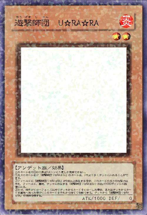 | このカード名の③の効果は1ターンに1度しか使用できない。 ①元々のカード名が「遊撃師団 U☆RA☆RA」のカードは、3枚より多くデッキに入れることができる。 ②フィールドに「遊撃師団 U☆RA☆RA」が5体以上存在する場合、このカードの元々の攻撃力は手札、フィールド、墓地、デッキに存在する「遊撃師団 U☆RA☆RA」の数×1000ポイントの数値になる。 ③自分、相手がドローフェイズ以外でデッキからカードをドローした場合、またはデッキからカードを墓地へ送った場合にこのカードを手札から捨てて発動できる。デッキから「遊撃師団 U☆RA☆RA」を特殊召喚する。 | |||
