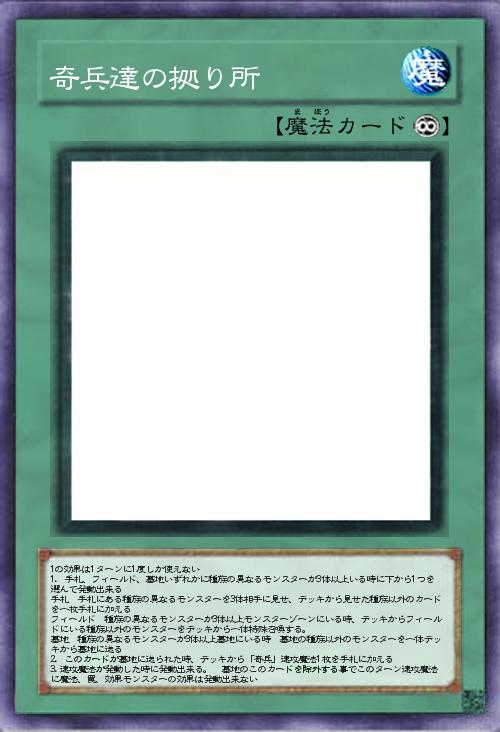 | 1の効果は1ターンに1度しか使えない 1. 手札、フィールド、墓地いずれかに種族の異なるモンスターが3体以上いる時に下から1つを選んで発動出来る 手札 手札にある種族の異なるモンスターを3体相手に見せ、デッキから見せた種族以外のカードを一枚手札に加える フィールド 種族の異なるモンスターが3体以上モンスターゾーンにいる時、デッキからフィールドにいる種族以外のモンスターをデッキから一体特殊召喚する。 墓地 種族の異なるモンスターが3体以上墓地にいる時 墓地の種族以外のモンスターを一体デッキから墓地に送る 2. このカードが墓地に送られた時、デッキから「奇兵」速攻魔法1枚を手札に加える 3.速攻魔法が発動した時に発動出来る。 墓地のこのカードを除外する事でこのターン速攻魔法に魔法、罠、効果モンスターの効果は発動出来ない | |||