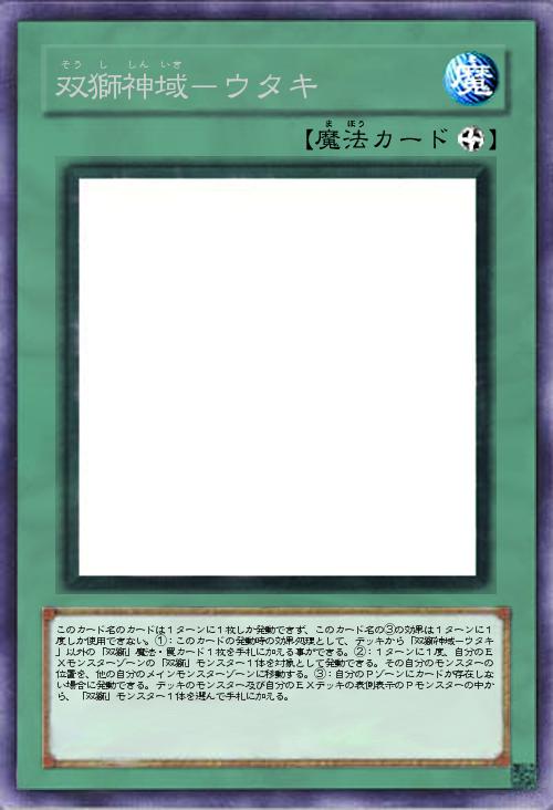 | このカード名のカードは1ターンに1枚しか発動できず、このカード名の③の効果は1ターンに1度しか使用できない。①:このカードの発動時の効果処理として、デッキから「双獅神域-ウタキ」以外の「双獅」魔法・罠カード1枚を手札に加える事ができる。②:1ターンに1度、自分のEXモンスターゾーンの「双獅」モンスター1体を対象として発動できる。その自分のモンスターの位置を、他の自分のメインモンスターゾーンに移動する。③:自分のPゾーンにカードが存在しない場合に発動できる。デッキのモンスター及び自分のEXデッキの表側表示のPモンスターの中から、「双獅」モンスター1体を選んで手札に加える。 | |||