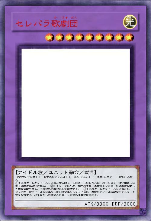 | 「紫京院 ひびき」+「目覚めのファルル」+「北条 そふぃ」+「東堂 シオン」+「白玉 みかん」 ①:このカードがフィールドに存在する限り、このカードのレベル以下のモンスターは守備表示になり効果が無効化される。 ②:1ターンに1度、相手の手札・墓地のモンスターの効果が発動した場合発動できる。その効果を無効にして破壊する。 ③:このカードがフィールドに存在し、「セレパラ」がフィールドに存在しない場合エンドフェイズに、墓地のアイドル族融合モンスター1体を除外する。出来なかった場合このカードの効果は無効化される。 | |||