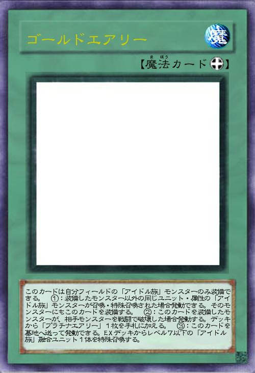 | このカードは自分フィールドの「アイドル族」モンスターのみ装備できる。 ①:装備したモンスター以外の同じユニット・属性の「アイドル族」モンスターが召喚・特殊召喚された場合発動できる。そのモンスターにもこのカードを装備する。 ②:このカードを装備したモンスターが、相手モンスターを戦闘で破壊した場合発動する。デッキから「プラチナエアリー」1枚を手札に加える。 ③:このカードを墓地へ送って発動できる。EXデッキからレベル7以下の「アイドル族」融合ユニット1体を特殊召喚する。 | |||