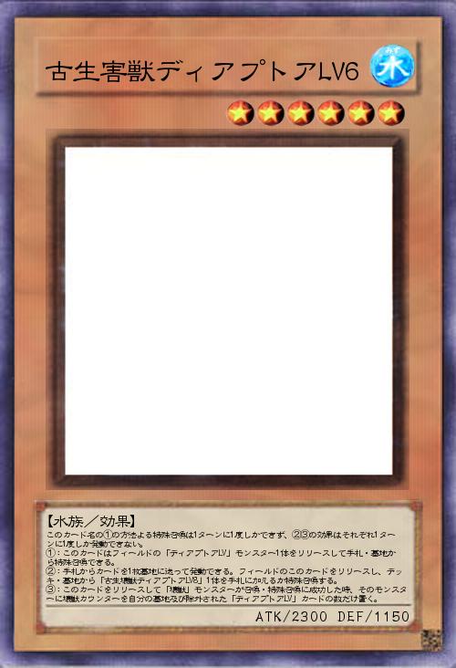 | このカード名の①の方法よる特殊召喚は1ターンに1度しかできず、②③の効果はそれぞれ1ターンに1度しか発動できない。 ①:このカードはフィールドの「ディアプトアLV」モンスター1体をリリースして手札・墓地から特殊召喚できる。 ②:手札からカードを1枚墓地に送って発動できる。フィールドのこのカードをリリースし、デッキ・墓地から「古生壊獣ディアプトアLV8」1体を手札に加えるか特殊召喚する。 ③:このカードをリリースして「壊獣」モンスターが召喚・特殊召喚に成功した時、そのモンスターに壊獣カウンターを自分の墓地及び除外された「ディアプトアLV」カードの数だけ置く。 | |||