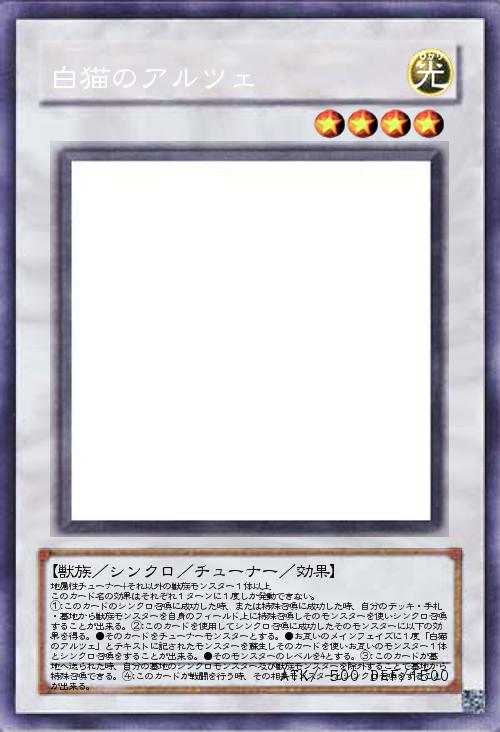 | 地属性チューナー+それ以外の獣族モンスター1体以上 このカード名の効果はそれぞれ1ターンに1度しか発動できない。 ①:このカードのシンクロ召喚に成功した時、または特殊召喚に成功した時、自分のデッキ・手札・墓地から獣族モンスターを自身のフィールド上に特殊召喚しそのモンスターを使いシンクロ召喚することが出来る。②:このカードを使用してシンクロ召喚に成功したそのモンスターに以下の効果を得る。●そのカードをチューナーモンスターとする。●お互いのメインフェイズに1度「白猫のアルツェ」とテキストに記されたモンスターを蘇生しそのカードを使いお互いのモンスター1体とシンクロ召喚をすることが出来る。●そのモンスターのレベルを4とする。③:このカードが墓地へ送られた時、自分の墓地のシンクロモンスター及び獣族モンスターを除外することで墓地から特殊召喚できる。④:このカードが戦闘を行う時、その相手モンスターとシン | |||