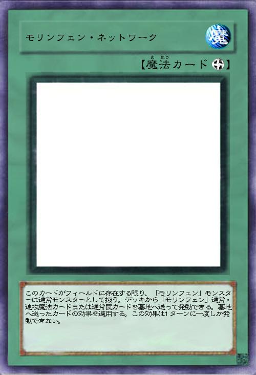 | このカードがフィールドに存在する限り、「モリンフェン」モンスターは通常モンスターとして扱う。デッキから「モリンフェン」通常・速攻魔法カードまたは通常罠カードを墓地へ送って発動できる。墓地へ送ったカードの効果を適用する。この効果は1ターンに一度しか発動できない。 | |||