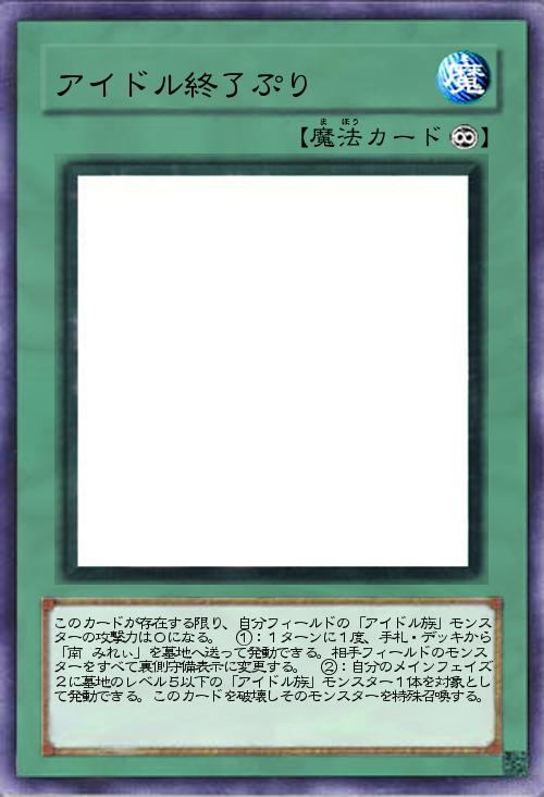 | このカードが存在する限り、自分フィールドの「アイドル族」モンスターの攻撃力は0になる。 ①:1ターンに1度、手札・デッキから「南 みれぃ」を墓地へ送って発動できる。相手フィールドのモンスターをすべて裏側守備表示に変更する。 ②:自分のメインフェイズ2に墓地のレベル5以下の「アイドル族」モンスター1体を対象として発動できる。このカードを破壊しそのモンスターを特殊召喚する。 | |||