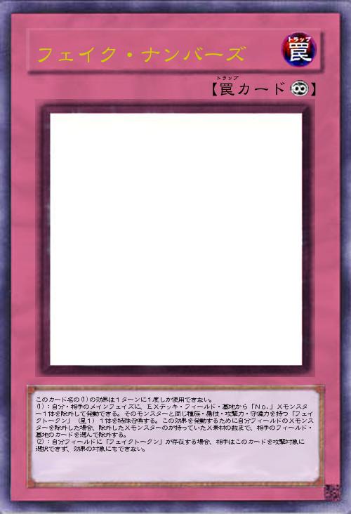 | このカード名の(1)の効果は1ターンに1度しか使用できない。 (1):自分・相手のメインフェイズに、EXデッキ・フィールド・墓地から「No.」Xモンスター1体を除外して発動できる。そのモンスターと同じ種族・属性・攻撃力・守備力を持つ「フェイクトークン」(星1)1体を特殊召喚する。この効果を発動するために自分フィールドのXモンスターを除外した場合、除外したXモンスターのが持っていたX素材の数まで、相手のフィールド・墓地のカードを選んで除外する。 (2):自分フィールドに「フェイクトークン」が存在する場合、相手はこのカードを攻撃対象に選択できず、効果の対象にもできない。 | |||