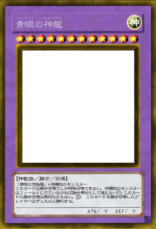 | 「青眼の究極竜」+神属性のモンスター このカードは融合召喚でしか特殊召喚できない。神属性のモンスターはフィールドにでていなければ融合素材として使えない①:このカードの融合召喚は無効化されない。②: このカードを融合召喚したプレイヤーはデュエルに勝利する。 | |||