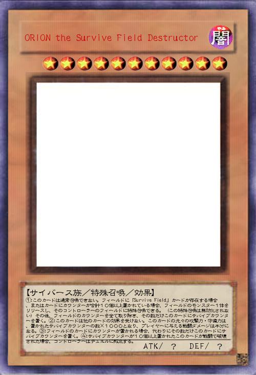 | ①:このカードは通常召喚できない。フィールドに「Survive Field」カードが存在する場合、またはカードにカウンターが合計10個以上置かれている場合、フィールドのモンスター1体をリリースし、そのコントローラーのフィールドに特殊召喚できる。(この特殊召喚は無効化されない)その後、フィールドのカウンターを全て取り除き、その数だけこのカードにサバイブカウンターを置く。②:このカードは他のカードの効果を受けない。このカードの元々の攻撃力・守備力は、置かれたサバイブカウンターの数×1000となり、プレイヤーに与える戦闘ダメージは半分になる。③:フィールドのカードにカウンターが置かれる場合、代わりにその数だけこのカードにサバイブカウンターを置く。④:サバイブカウンターが10個以上置かれたこのカードが戦闘で破壊された場合、コントローラーはデュエルに敗北する。 | |||