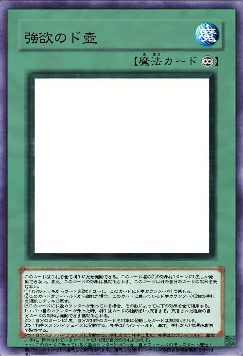 | このカードは手札を全て相手に見せ発動できる。このカード名の①の効果は1ターンに1度しか発動できない。また、このカードの効果は無効化されず、このカード以外の自分のカードの効果を受けない。 ①自分のデッキからカードを2枚ドローし、このカードにド壺カウンターを1つ乗せる。 ②このカードがフィールドから離れた場合、このカードに乗っているド壺カウンター×2枚の手札を選択しデッキに戻す。 ③このカードにド壺カウンターが乗っている場合、その数によって以下の効果を全て適用する。 1つ:1つ目のカウンターが乗った時、相手はカードの種類を1つ宣言する。宣言された種類の自分カードの効果は発動できず無効化される。 2つ:自分のターンに1度、自分が相手のカードを対象に発動したカードは無効化される。 3つ:相手スタンバイフェイズに発動する。相手は自分フィールド、墓地、手札から1枚選び裏側で除外する。 4つ:自分スタン | |||