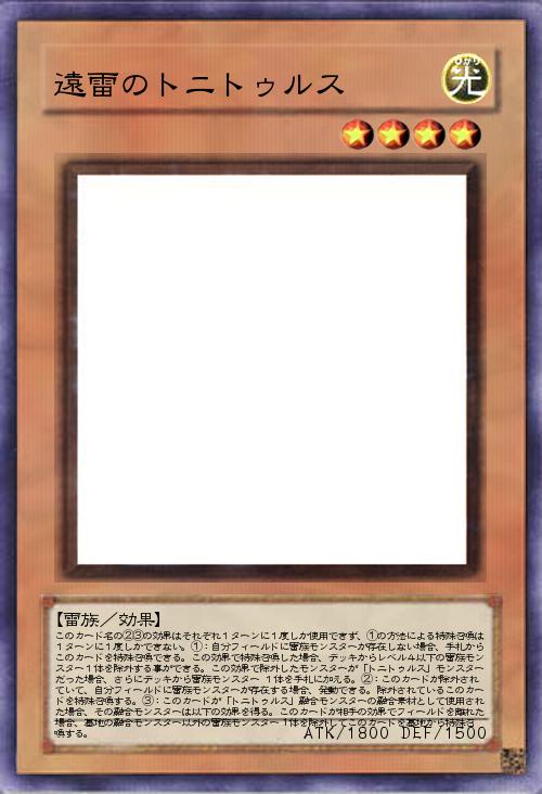 | このカード名の②③の効果はそれぞれ1ターンに1度しか使用できず、①の方法による特殊召喚は1ターンに1度しかできない。①:自分フィールドに雷族モンスターが存在しない場合、手札からこのカードを特殊召喚できる。この効果で特殊召喚した場合、デッキからレベル4以下の雷族モンスター1体を除外する事ができる。この効果で除外したモンスターが「トニトゥルス」モンスターだった場合、さらにデッキから雷族モンスター 1体を手札に加える。②:このカードが除外されていて、自分フィールドに雷族モンスターが存在する場合、発動できる。除外されているこのカードを特殊召喚する。③:このカードが「トニトゥルス」融合モンスターの融合素材として使用された場合、その融合モンスターは以下の効果を得る。このカードが相手の効果でフィールドを離れた場合、墓地の融合モンスター以外の雷族モンスター 1体を除外してこのカードを墓地から特殊召喚する。 | |||