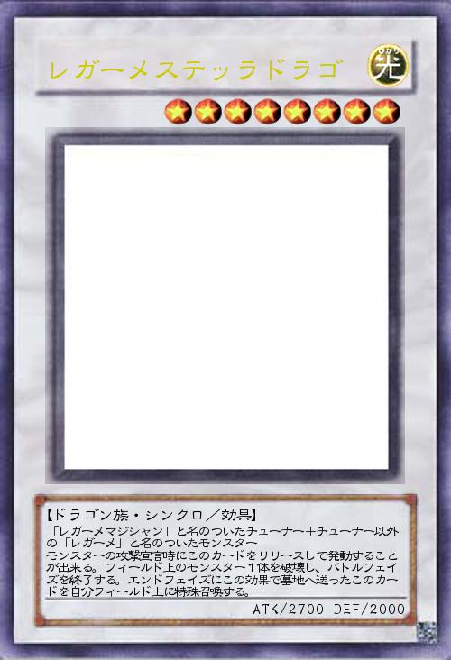 「攻撃以外に対しては無防備ですが、それでも攻撃を阻止できるのはかなりの抑止力になりますね。良いと思います。で、一つ気になったのですが、素材は「レガーメマジシャン」のチューナー1体と、「レガーメ」と名の付いたモンスター1体の縛り何ですか?」(2012-07-20 21:26)