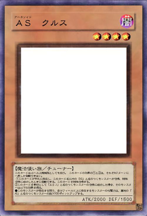 | このカードはルール上機械族としても扱う。 このカードの効果の①と②は、それぞれ1ターンに一度しか発動できない。 ①このカードが手札に存在し、このカード名以外の「AS」と名のつくモンスターが召喚、特殊召喚に成功したときに発動できる。このカードを特殊召喚する。 ②このカードを素材として「ASJ」と名のつくモンスターの召喚に成功した場合、そのモンスターは以下の効果を得る。 ●このモンスターが存在する限り、自分フィールド上に存在するモンスターの攻撃力は、墓地の「AS」と名のつくモンスターの数×100ポイントアップする。 | |||