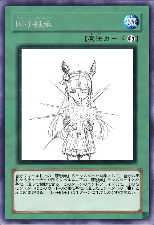 | 自分フィールド上の「駆獣娘」Sモンスターを対象として、自分の手札からチューナーを除くレベル4以下の「駆獣娘」モンスター1体を墓地に送って発動できる。このターンのエンドフェイズまで、そのSモンスターはこのカードの効果で墓地に送ったモンスターの「●」と同じ効果を得る。「因子継承」は1ターンに1度しか発動できない。 | |||