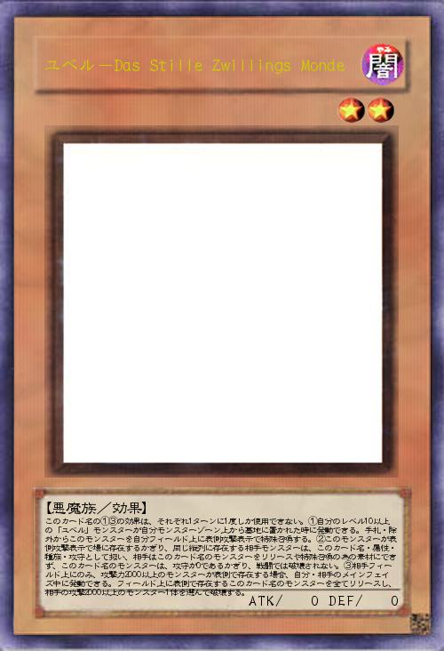 | このカード名の①③の効果は、それぞれ1ターンに1度しか使用できない。①自分のレベル10以上の「ユベル」モンスターが自分モンスターゾーン上から墓地に置かれた時に発動できる。手札・除外からこのモンスターを自分フィールド上に表側攻撃表示で特殊召喚する。②このモンスターが表側攻撃表示で場に存在するかぎり、同じ縦列に存在する相手モンスターは、このカード名・属性・種族・攻守として扱い、相手はこのカード名のモンスターをリリースや特殊召喚の為の素材にできず、このカード名のモンスターは、攻守が0であるかぎり、戦闘では破壊されない。③相手フィールド上にのみ、攻撃力2000以上のモンスターが表側で存在する場合、自分・相手のメインフェイズ中に発動できる。フィールド上に表側で存在するこのカード名のモンスターを全てリリースし、相手の攻撃2000以上のモンスター1体を選んで破壊する。 | |||