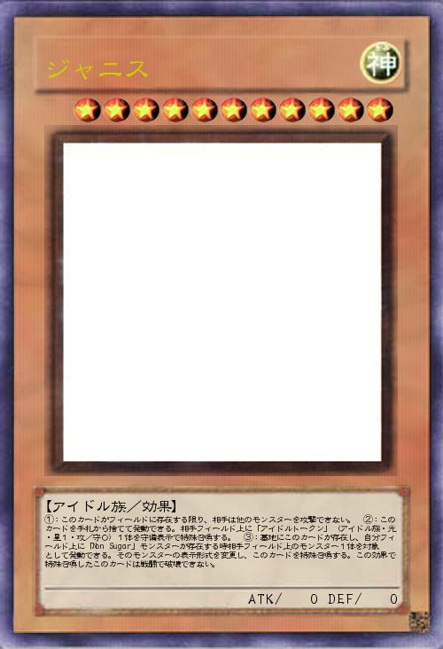 | ①:このカードがフィールドに存在する限り、相手は他のモンスターを攻撃できない。 ②:このカードを手札から捨てて発動できる。相手フィールド上に「アイドルトークン」(アイドル族・光・星1・攻/守0)1体を守備表示で特殊召喚する。 ③:墓地にこのカードが存在し、自分フィールド上に「Non Sugar」モンスターが存在する時相手フィールド上のモンスター1体を対象として発動できる。そのモンスターの表示形式を変更し、このカードを特殊召喚する。この効果で特殊召喚したこのカードは戦闘で破壊できない。 | |||