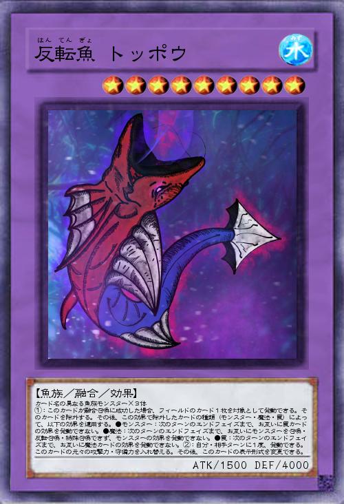 魚族で融合って中々無いんじゃ?そして魚族と融合って相性悪そうだし壊してもよくね?と思いなんちゃってショックルーラー効果を内蔵してみました。「反転魚」とありますがリバース、反転召喚に関係する効果ではなく攻守の反転及び表示形式を反転させる効果になっています。リバース関係でも考えたけど大分デザインが難航したのでこういう形に落ち着きました。