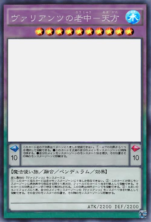 | 同じ属性の「ヴァリアンツ」モンスター×2 ①:このカード名のカードは自分モンスターゾーンに1体しか存在できない。②:このカードが同じモンスターゾーンに表側表示で存在する限り1度だけ、フィールドのカード1枚を対象として発動できる。そのカードの効果はターン終了時まで無効化される。この効果は相手ターンでも発動できる。③:お互いのエンドフェイズに1度、自分のメインモンスターゾーンの「ヴァリアンツ」モンスター1体を対象として発動できる。その自分のモンスターの位置を、その隣のモンスターゾーンに移動する。 | |||