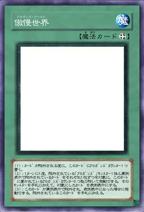 | (1):カードが除外される度に、このカードにアロガンズカウンター1つ置く。 (2):1ターンに1度、除外されている「アロガンズ」モンスター1体と裏側表示で除外されているカードをそれぞれ1枚ずつを対象に、このカードに置かれているアロガンズカウンター5つ取り除いて発動できる。そのモンスターを手札に加えて、対象にしたカードを表側表示にする。 (3):このカードが裏側表示で除外され、表側表示になった場合に発動できる。除外されているこのカードを手札に加える。 | |||