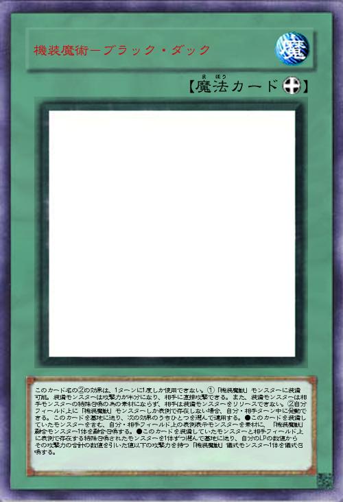 | このカード名の②の効果は、1ターンに1度しか使用できない。①「機装魔獣」モンスターに装備可能。装備モンスターは攻撃力が半分になり、相手に直接攻撃できる。また、装備モンスターは相手モンスターの特殊召喚の為の素材にならず、相手は装備モンスターをリリースできない。②自分フィールド上に「機装魔獣」モンスターしか表側で存在しない場合、自分・相手ターン中に発動できる。このカードを墓地に送り、次の効果のうちひとつを選んで適用する。●このカードを装備していたモンスターを含む、自分・相手フィールド上の表側表示モンスターを素材に、「機装魔獣」融合モンスター1体を融合召喚する。●このカードを装備していたモンスターと相手フィールド上に表側で存在する特殊召喚されたモンスターを1体ずつ選んで墓地に送り、自分のLPの数値からその攻撃力の合計の数値を引いた値以下の攻撃力を持つ「機装魔獣」儀式モンスター1体を儀式召喚する。 | |||
