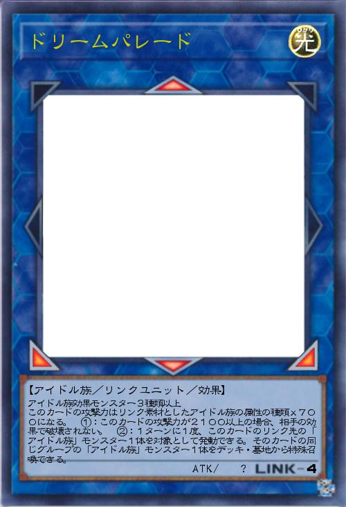 | アイドル族効果モンスター3種類以上 このカードの攻撃力はリンク素材としたアイドル族の属性の種類x700になる。 ①:このカードの攻撃力が2100以上の場合、相手の効果で破壊されない。 ②:1ターンに1度、このカードのリンク先の「アイドル族」モンスター1体を対象として発動できる。そのカードの同じグループの「アイドル族」モンスター1体をデッキ・墓地から特殊召喚できる。 | |||