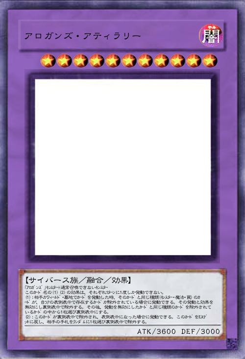 | 「アロガンズ」モンスター+通常召喚できないモンスター このカード名の(1)(2)の効果は、それぞれ1ターンに1度しか発動できない。 (1):相手がフィールド・墓地でカードを発動した時、そのカードと同じ種類(モンスター・魔法・罠)のカードが、自分の表側表示で存在するカードが除外されている場合に発動できる。その発動と効果を無効にし裏側表示で除外する。その後、発動を無効にしたカードと同じ種類のカードを除外されているカードの中から1枚選び裏側表示にする。 (2):このカードが裏側表示で除外され、表側表示になった場合に発動できる。このカードをEXデッキに戻し、相手の手札をランダムに1枚選び裏側表示で除外する。 | |||
