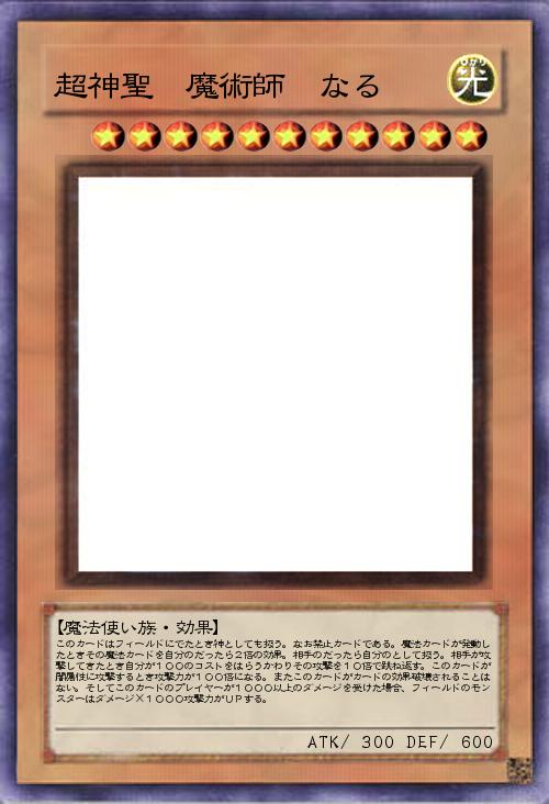 | このカードはフィールドにでたとき神としても扱う。なお禁止カードである。魔法カードが発動したときその魔法カードを自分のだったら2倍の効果。相手のだったら自分のとして扱う。相手が攻撃してきたとき自分が100のコストをはらうかわりその攻撃を10倍で跳ね返す。このカードが闇属性に攻撃するとき攻撃力が100倍になる。またこのカードがカードの効果破壊されることはない。そしてこのカードのプレイヤーが1000以上のダメージを受けた場合、フィールドのモンスターはダメージ×1000攻撃力がUPする。 | |||