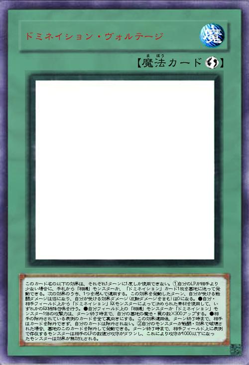 | このカード名の以下の効果は、それぞれ1ターンに1度しか使用できない。①自分のLPが相手より少ない場合に、手札から「相縛」モンスターか、「ドミネイション」カード1枚を墓地に送って発動できる。次の効果のうち、1つを選んで適用する。この効果を発動したターン、自分が受ける戦闘ダメージは倍になり、自分が受ける効果ダメージ(反転ダメージを含む)は0になる。●自分・相手フィールド上から「ドミネイション」EXモンスターによって決められた素材を使用して、いずれかのEX特殊召喚を行う。●自分フィールド上の「相縛」モンスターか「ドミネイション」モンスター1体の攻撃力は、ターン終了時まで、自分の墓地の魔法・罠の数×300アップする。●相手の除外されている表側のカードを全て裏向きにする。この効果適用後、ターン終了時まで、相手はカードを除外できず、自分のカードは除外されない。②自分のモンスターが戦闘・効果で破壊された場合、墓地のこのカードを除外して発動できる。ターン終了時まで、相手フィールド上に表側で存在するモンスターは相手のLPの数値分攻守がダウンし、これにより攻守が1000以下になったモンスターは効果が無効化される。 | |||