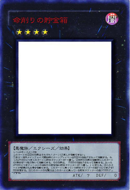 | レベル4モンスター3体 このカードの②③の効果はそれぞれ1ターンに1度しか発動できない。 ①自分・相手メインフェイズ開始時にターンプレイヤーは1000の倍数LPを払って発動する。払ったLP1000につきこのカードに貯金カウンターを1つ置く。②相手の効果の発動時にこのカードのX素材を1つ取り除いて発動できる。その効果は、「1000の倍数LPを払って発動する。払ったLP1000につきフィールドの命削りの貯金箱に貯金カウンターを1つ置く。」に変える。③このカードが破壊された場合発動できる。このカードに乗っていた貯金カウンターの数1つにつきLPを1000回復する。④このカードの攻撃力はこのカードに乗っている貯金カウンターの数×1000アップする。 | |||