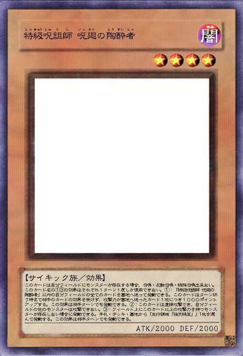 | このカードは自分フィールドにモンスターが存在する場合、召喚・反転召喚・特殊召喚出来ない。このカード名の①③の効果はそれぞれ1ターン1度しか使用できない。①:「特級呪詛師 呪廻の陶酔者」以外の自分フィールドの全てのカードを墓地へ送って発動できる。このカードはターン終了時まで相手のカードの効果を受けず、攻撃力が墓地へ送ったカード1枚につき1000ポイントアップする。この効果は相手ターンでも発動できる。②:このカードは直接攻撃でき、自分フィールドの他のモンスターは攻撃できない。③:フィールド上にこのカード以上の攻撃力を持つモンスターが存在しない場合に発動できる。手札・デッキ・墓地から「並行領域「極天特至」」1枚を選んで発動する。この効果は相手ターンでも発動できる。 | |||