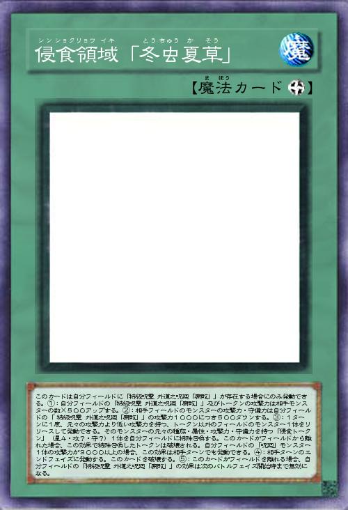 | このカードは自分フィールドに「特級呪霊 外道之呪廻「腐敗」」が存在する場合にのみ発動できる。①:自分フィールドの「特級呪霊 外道之呪廻「腐敗」」及びトークンの攻撃力は相手モンスターの数×500アップする。②:相手フィールドのモンスターの攻撃力・守備力は自分フィールドの「 特級呪霊 外道之呪廻「腐敗」」の攻撃力1000につき500ダウンする。③:1ターンに1度、元々の攻撃力より低い攻撃力を持つ、トークン以外のフィールドのモンスター1体をリリースして発動できる。そのモンスターの元々の種族・属性・攻撃力・守備力を持つ「侵食トークン」(星4・攻?・守?)1体を自分フィールドに特殊召喚する。このカードがフィールドから離れた場合、この効果で特殊召喚したトークンは破壊される。自分フィールドの「呪廻」モンスター1体の攻撃力が3000以上の場合、この効果は相手ターンでも発動できる。④:相手ターンのエンドフェイズに発動する。このカードを破壊する。⑤:このカードがフィールドを離れる場合、自分フィールドの「特級呪霊 外道之呪廻「腐敗」」の効果は次のバトルフェイズ開始時まで無効になる。 | |||