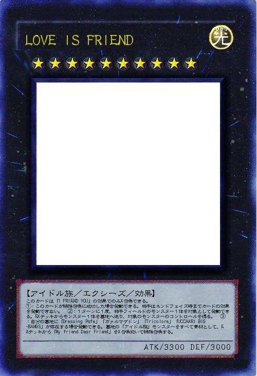 | このカードは「I FRIEND YOU」の効果でのみX召喚できる。 ①:このカードが特殊召喚に成功した場合発動できる。相手はエンドフェイズ時までカードの効果を発動できない。 ②:1ターンに1度、相手フィールドのモンスター1体を対象として発動できる。EXデッキからモンスター1体を墓地へ送り、対象のモンスターのコントロールを得る。 ③:自分の墓地に「Dressing Pafe」「ガァルマゲドン」「Tricolore」「UCCHARI BIG-BANGS」が存在する場合発動できる。墓地の「アイドル族」モンスターをすべて素材として、EXデッキから「My friend Dear Friend」をX召喚扱いで特殊召喚する。 | |||