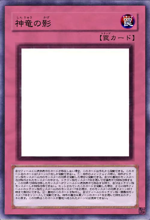 | 自分フィールドに表側表示のカードが存在しない場合、このカードは手札から発動できる。このカード名のカードは1ターンに1枚しか発動できない。①:相手のメインフェイズ時に、相手がドラゴン族モンスター以外のモンスターの効果を発動した場合に発動できる。自分の墓地のモンスター及び除外されたモンスターの中から、ドラゴン族モンスター1体を選んで守備表示で特殊召喚する。この効果で特殊召喚したモンスターがフィールドに表側表示で存在する限り、自分はドラゴン族モンスターしか特殊召喚できない。セットされていたこのカードを発動した場合、さらに相手フィールドのドラゴン族モンスター以外のモンスター1体を選び、そのモンスターの効果をターン終了時まで無効にできる。②:墓地のこのカードを除外し、自分フィールドのドラゴン族・闇属性モンスター1体をリリースして発動できる。相手の魔法&罠ゾーンのカード1枚を選んで持ち主のデッキに戻す。この効果はこのカードが墓地へ送られたターンには使用できない。 | |||
