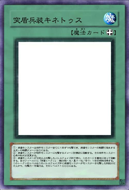 | ①:装備モンスターは相手モンスター全てに1回ずつ攻撃でき、装備モンスターの戦闘で発生するお互いの戦闘ダメージは0になる。 ②:装備モンスターが相手モンスターに攻撃するダメージ計算前に発動する。その相手モンスターの表示形式を変更する。 ③:装備モンスターが3回以上攻撃したバトルフェイズ終了時に、このカードを墓地に送って発動する。自分フィールドに「突盾トークン」(戦士族・光・星?・攻/守?)1体を特殊召喚する。このトークンのレベルはこのバトルフェイズ中に装備モンスターがモンスターを攻撃した回数分だけ上がり、攻撃力・守備力は、そのレベル×1000になる。 | |||