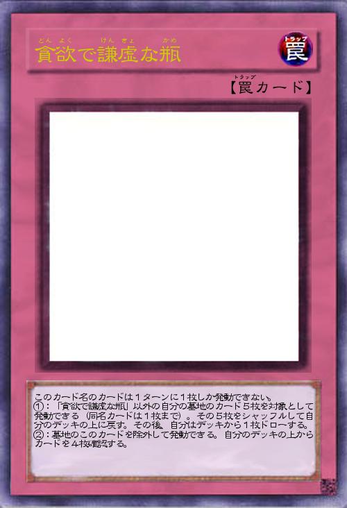 | このカード名のカードは1ターンに1枚しか発動できない。 ①:「貪欲で謙虚な瓶」以外の自分の墓地のカード5枚を対象として発動できる(同名カードは1枚まで)。その5枚をシャッフルして自分のデッキの上に戻す。その後、自分はデッキから1枚ドローする。 ②:墓地のこのカードを除外して発動できる。自分のデッキの上からカードを4枚確認する。 | |||