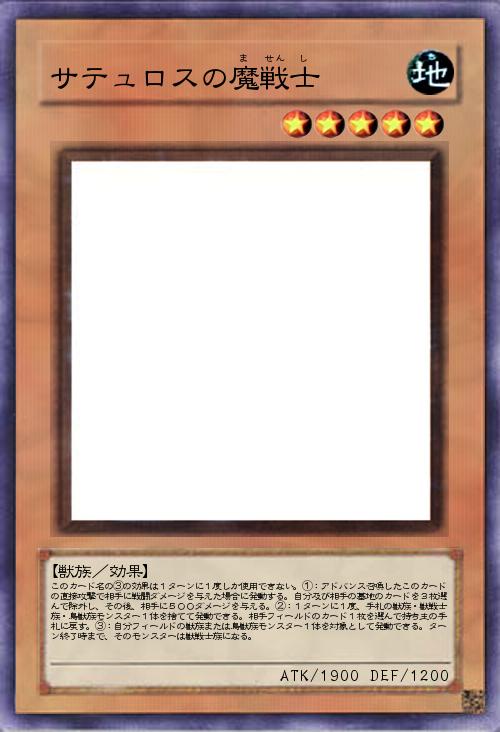 | このカード名の③の効果は1ターンに1度しか使用できない。①:アドバンス召喚したこのカードの直接攻撃で相手に戦闘ダメージを与えた場合に発動する。自分及び相手の墓地のカードを3枚選んで除外し、その後、相手に500ダメージを与える。②:1ターンに1度、手札の獣族・獣戦士族・鳥獣族モンスター1体を捨てて発動できる。相手フィールドのカード1枚を選んで持ち主の手札に戻す。③:自分フィールドの獣族または鳥獣族モンスター1体を対象として発動できる。ターン終了時まで、そのモンスターは獣戦士族になる。 | |||