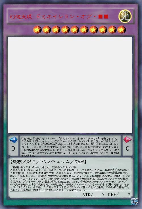 | ①自分は「相縛」モンスター・「ドミネイション」モンスターしかP召喚できない。この効果は無効化されない。②このカード名で1ターンに1度、自分が「ドミネイション」モンスターの特殊召喚に成功した場合に発動できる。自分はデッキから1枚ドローし、2000LP回復する。③自分のLPが3000以下の場合、相手モンスターの攻撃宣言時に発動出来る。PゾーンのこのモンスターをEXデッキに戻し、自分はフィールド上のモンスターを素材に、「ドミネイション」融合モンスター1体を融合召喚する。 | |||