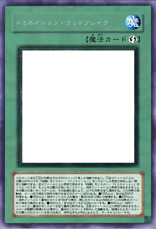 | このカード名の①②の効果はそれぞれ1ターンに1度しか発動できない。①自分フィールド上に、攻撃力2000以下の「相縛」モンスター・「ドミネイション」モンスターしか表側で存在しない場合に発動できる。自分フィールド上に表側で存在する「相縛」モンスター・「ドミネイション」モンスターのうち、もっとも攻撃力が低いモンスターと、相手フィールド上に表側で存在するもっとも攻撃力の高いモンスターとの、その数値の差により、以下の効果を全て適用する。この効果の発動後、ターン終了時まで相手が受ける全てのダメージは0になる。●1000以上:自分は2000LP回復する。●1500以上:相手フィールド上の魔法・罠を2枚まで選んで破壊する。●2000以上:相手フィールド・墓地のカードを1枚ずつ選び、選んだカードおよび同名カードの効果をターン終了時まで無効にする。●3000以上:自分はデッキから2枚ドローする。●5000以上:相手フィールド上・墓地のモンスターを全て裏側で除外する。②自分フィールド上に表側で存在するモンスターが戦闘で破壊された場合に、墓地のこのカードを除外して発動する。破壊されたモンスターの攻撃力分のダメージを自分は受け、相手は手札が5枚になるよう、デッキからドローする。 | |||