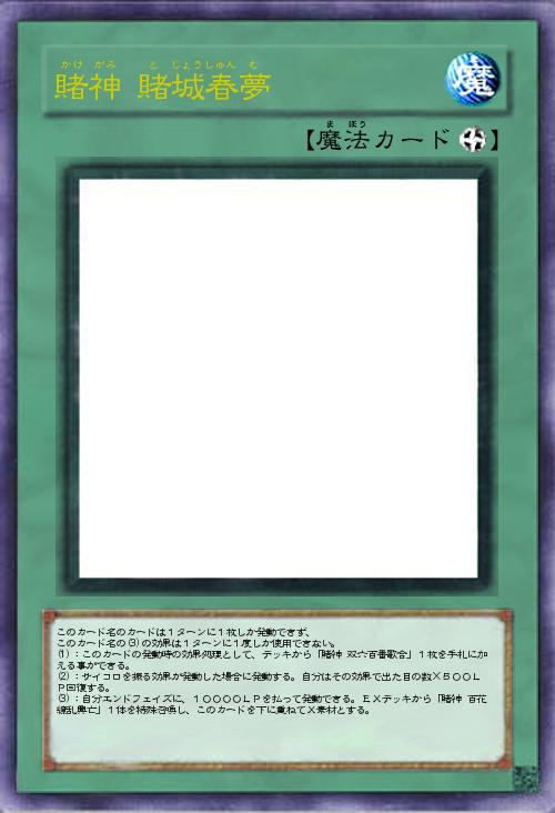 | このカード名のカードは1ターンに1枚しか発動できず、 このカード名の(3)の効果は1ターンに1度しか使用できない。 (1):このカードの発動時の効果処理として、デッキから「賭神 双六百番歌合」1枚を手札に加える事ができる。 (2):サイコロを振る効果が発動した場合に発動する。自分はその効果で出た目の数×500LP回復する。 (3):自分エンドフェイズに、10000LPを払って発動できる。EXデッキから「賭神 百花繚乱興亡」1体を特殊召喚し、このカードを下に重ねてX素材とする。 | |||