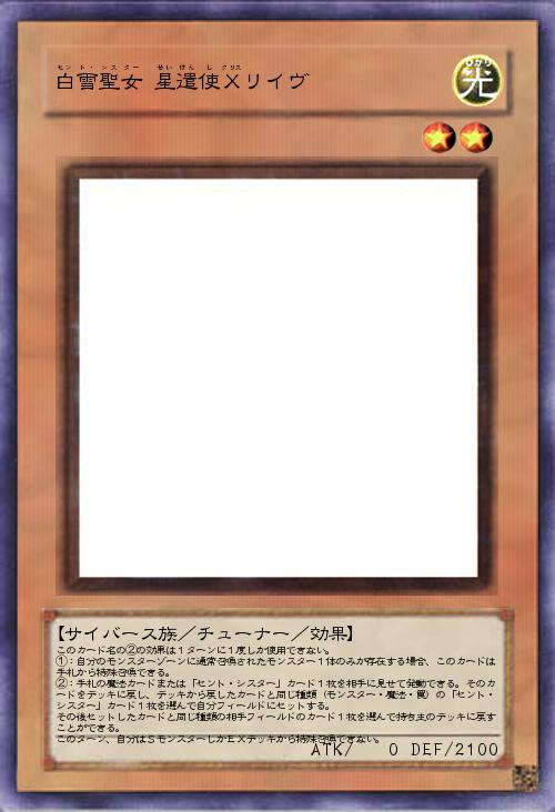 | このカード名の②の効果は1ターンに1度しか使用できない。 ①:自分のモンスターゾーンに通常召喚されたモンスター1体のみが存在する場合、このカードは手札から特殊召喚できる。 ②:手札の魔法カードまたは「セント・シスター」カード1枚を相手に見せて発動できる。そのカードをデッキに戻し、デッキから戻したカードと同じ種類(モンスター・魔法・罠)の「セント・シスター」カード1枚を選んで自分フィールドにセットする。 その後セットしたカードと同じ種類の相手フィールドのカード1枚を選んで持ち主のデッキに戻すことができる。 このターン、自分はSモンスターしかEXデッキから特殊召喚できない。 | |||
