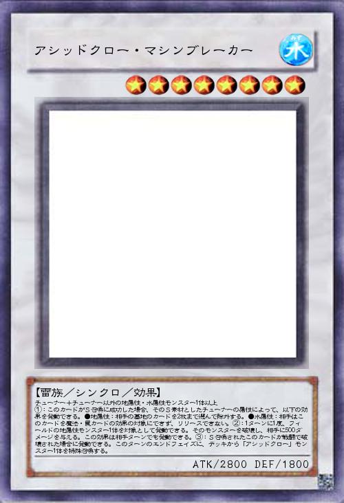 | チューナー+チューナー以外の地属性・水属性モンスター1体以上 ①:このカードがS召喚に成功した場合、そのS素材としたチューナーの属性によって、以下の効果を発動できる。●地属性:相手の墓地のカードを2枚まで選んで除外する。●水属性:相手はこのカードを魔法・罠カードの効果の対象にできず、リリースできない。②:1ターンに1度、フィールドの地属性モンスター1体を対象として発動できる。そのモンスターを破壊し、相手に500ダメージを与える。この効果は相手ターンでも発動できる。③:S召喚されたこのカードが戦闘で破壊された場合に発動できる。このターンのエンドフェイズに、デッキから「アシッドクロー」モンスター1体を特殊召喚する。 | |||