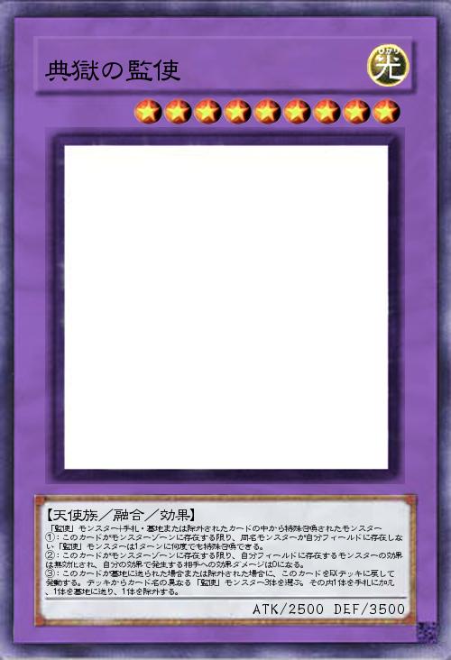 | 「監使」モンスター+手札・墓地または除外されたカードの中から特殊召喚されたモンスター ①:このカードがモンスターゾーンに存在する限り、同名モンスターが自分フィールドに存在しない「監使」モンスターは1ターンに何度でも特殊召喚できる。 ②:このカードがモンスターゾーンに存在する限り、自分フィールドに存在するモンスターの効果は無効化され、自分の効果で発生する相手への効果ダメージは0になる。 ③:このカードが墓地に送られた場合または除外された場合に、このカードをEXデッキに戻して発動する。デッキからカード名の異なる「監使」モンスター3体を選ぶ。その内1体を手札に加え、1体を墓地に送り、1体を除外する。 | |||