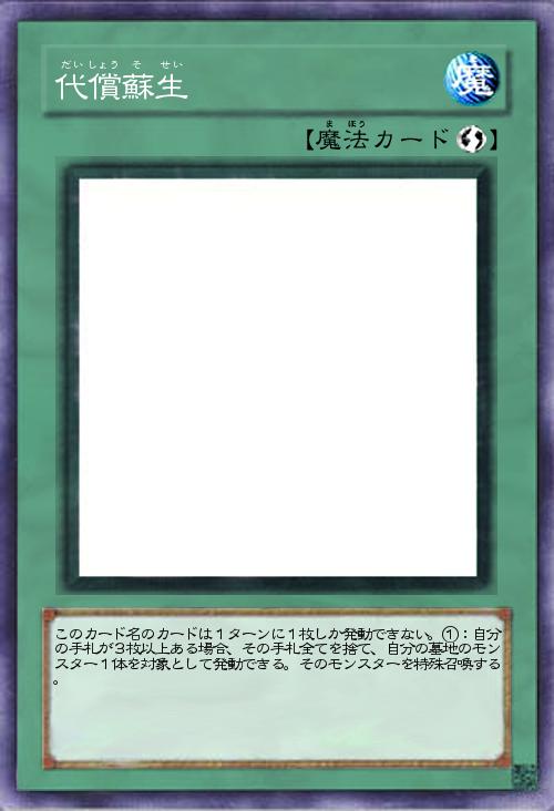 | このカード名のカードは1ターンに1枚しか発動できない。①:自分の手札が3枚以上ある場合、その手札全てを捨て、自分の墓地のモンスター1体を対象として発動できる。そのモンスターを特殊召喚する。 | |||