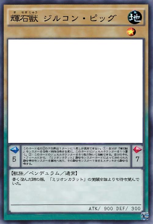 | このカード名の②のP効果は1ターンに1度しか使用できない。①:自分が「輝石獣」モンスターを召喚・特殊召喚する度に、このカードにジュエルカウンターを1つ置く。②:このカードのジュエルカウンターを5つ取り除いて発動できる。自分の手札・フィールドから、「ミリオンカラット」融合モンスターカードによって決められた融合素材モンスターを墓地へ送り、その融合モンスター1体をEXデッキから融合召喚する。 | |||
