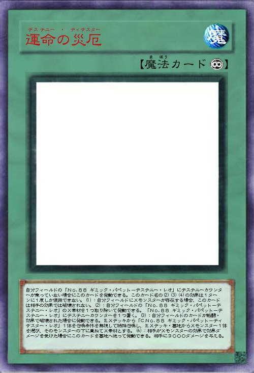 | 自分フィールドの「No.88 ギミック・パペット-デステニー・レオ」にデステニーカウンターが乗っていない場合にこのカードを発動できる。このカード名の(2)(3)(4)の効果は1ターンに1度しか使用できない。(1):自分フィールドにXモンスターが存在する場合、このカードは相手の効果では破壊されない。(2):自分フィールドの「No.88 ギミック・パペット-デステニー・レオ」のX素材を1つ取り除いて発動できる。「No.88 ギミック・パペット-デステニー・レオ」にデステニーカウンターを1つ置く。(3):自分フィールドのカードが戦闘・効果で破壊された場合に発動できる。EXデッキから「CNo.88 ギミック・パペット-ディザスター・レオ」1体を召喚条件を無視して特殊召喚し、EXデッキ・墓地からXモンスター1体を選び、そのモンスターの下に重ねてX素材とする。(4):相手がXモンスターの効果で効果ダメージを受けた場合にこのカードを墓地へ送って発動できる。相手に3000ダメージを与える。 | |||