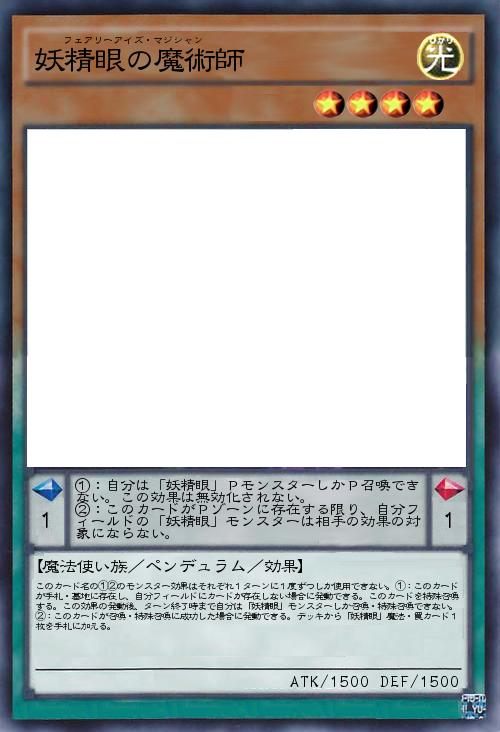 | ①:自分は「妖精眼」PモンスターしかP召喚できない。この効果は無効化されない。 ②:このカードがPゾーンに存在する限り、自分フィールドの「妖精眼」モンスターは相手の効果の対象にならない。 | |||