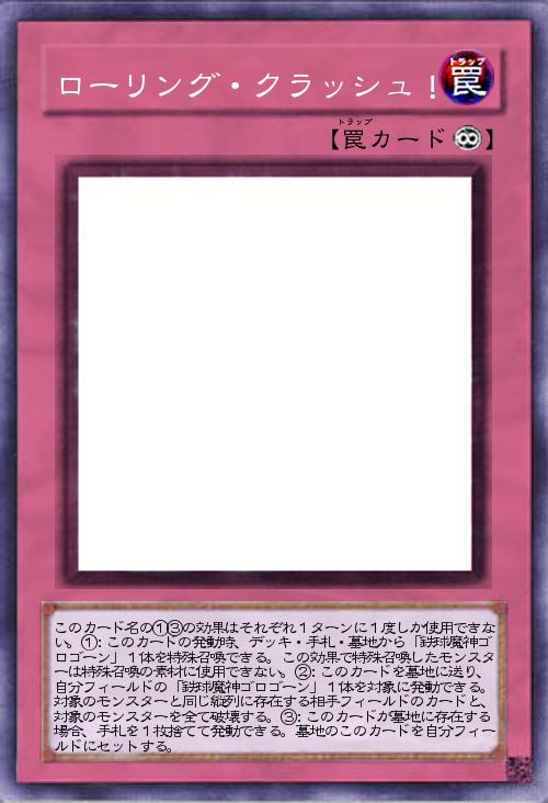 | このカード名の①③の効果はそれぞれ1ターンに1度しか使用できない。①:このカードの発動時、デッキ・手札・墓地から「鉄球魔神ゴロゴーン」1体を特殊召喚できる。この効果で特殊召喚したモンスターは特殊召喚の素材に使用できない。②:このカードを墓地に送り、自分フィールドの「鉄球魔神ゴロゴーン」1体を対象に発動できる。対象のモンスターと同じ縦列に存在する相手フィールドのカードと、対象のモンスターを全て破壊する。③:このカードが墓地に存在する場合、手札を1枚捨てて発動できる。墓地のこのカードを自分フィールドにセットする。 | |||