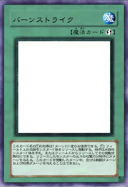 | このカード名の①の効果は1ターンに1度のみ使用できる。①:フィールド上の炎族モンスター1体をリリースし発動する。相手は水族モンスター1体を手札、またはフィールドからリリースしてその発動を無効にできる。リリースしたモンスターの元々の攻撃力分相手にダメージを与える。このカードを発動したターン中、自分は戦闘ダメージおよび効果ダメージを与えることはできない。 | |||