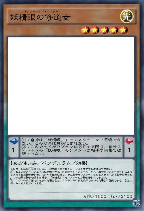 | ①:自分は「妖精眼」PモンスターしかP召喚できない。この効果は無効化されない。 ②:このカードがPゾーンに存在する限り、自分フィールドの「妖精眼」モンスターは相手の効果で破壊されない。 | |||